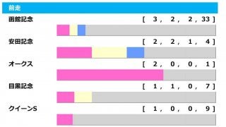 函館記念 【3-2-2-33】 勝率7.5%、連対率12.5%、複勝率17.5% 安田記念 【2-2-1-4】 勝率22.2%、連対率44.4%、複勝率55.6% オークス 【2-0-0-1】 勝率66.7%、連対率66.7%、複勝率66.7% 目黒記念 【1-1-0-7】 勝率11.1%、連対率22.2%、複勝率22.2% クイーンS 【1-0-0-9】 勝率16.0%、連対率16.0%、複勝率16.0% エプソムC 【1-0-0-2】 勝率33.3%、連対率33.3%、複勝率33.3% 宝塚記念 【0-2-1-6】 勝率0.0%、連対率22.2%、複勝率33.3% クイーンエリザベス2世C 【0-1-0-1】 勝率0.0%、連対率50.0%、複勝率50.0% ジャパンC 【0-1-0-1】 勝率0.0%、連対率50.0%、複勝率50.0% ドバイデューティF 【0-1-0-1】 勝率0.0%、連対率50.0%、複勝率50.0%