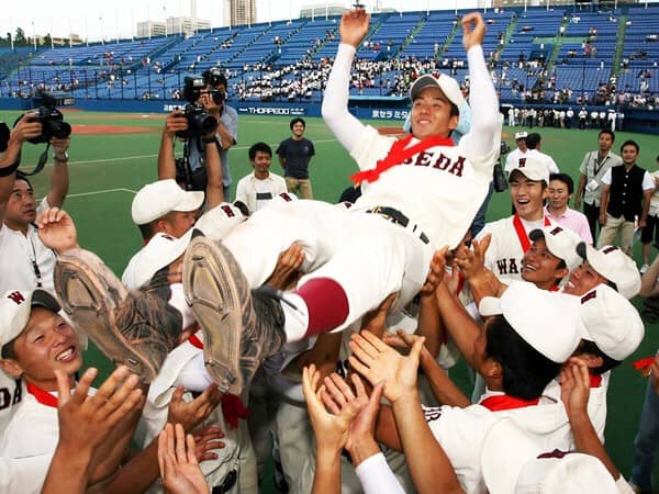 2006年夏、日大三を下し10年ぶり夏の甲子園出場を決め胴上げされる斎藤佑樹