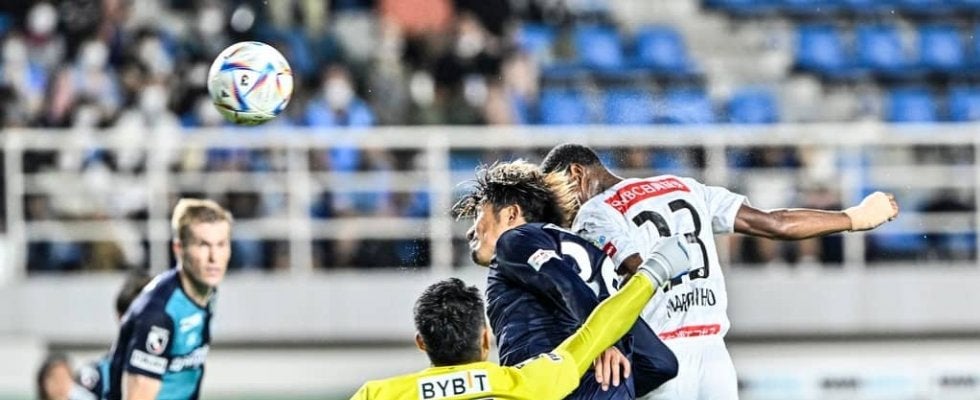 家長昭博のクロスに合わせてハットトリックを決める瞬間の川崎フロンターレFWマルシーニョ 撮影:中地拓也
