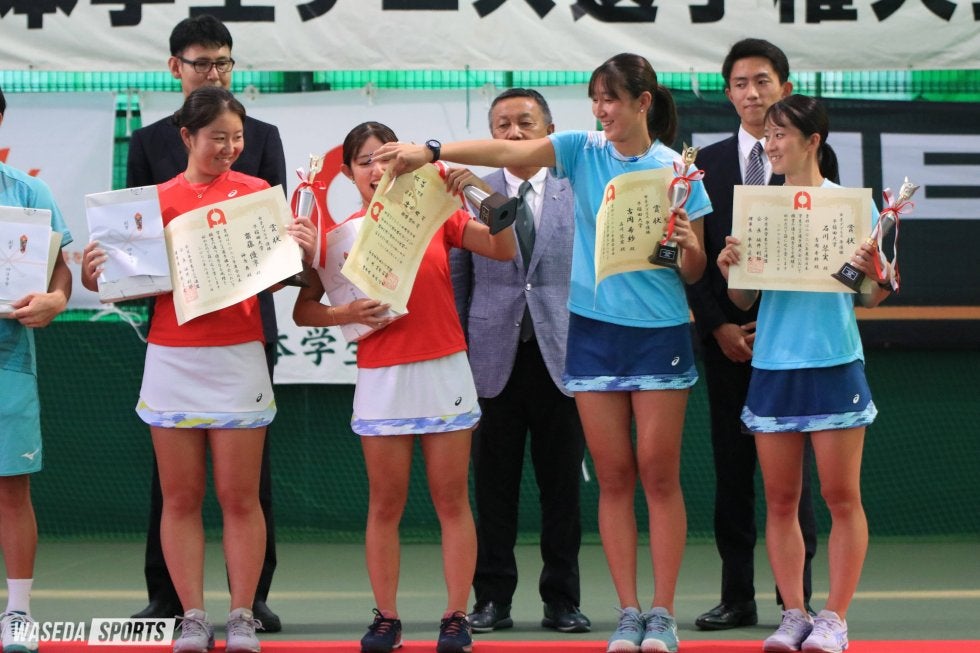 大会最終日の今日は、女子シングルスの決勝に神鳥舞(スポ2=東京・早実)が、ダブルス決勝・早大対決には斎藤優寧(スポ2=岡山学芸館)・神鳥組と吉岡希紗(スポ4=三重・四日市商)石川琴実(社4=神奈川・白鵬女)組が登場した。シングルスは同じく3年生の山崎郁美(亜大)に惜敗し準優勝、ダブルスは斎藤・神鳥組が制し、インカレ初優勝を飾った。