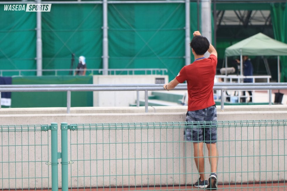 20日、シングルスを戦う丹下将太主将(教4=東京・早実)を応援する小林トレーナー