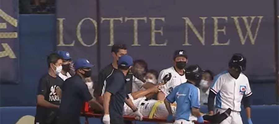 24日の西武戦、担架で運ばれたロッテ・福田秀平【画像:パーソル パ・リーグTV】
