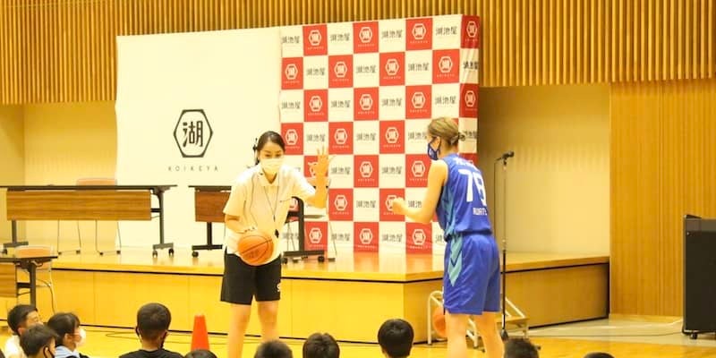 バスケットボール教室には中川さんに加えて、粟津雪乃(東京羽田)も出席。また、日本代表へと招集されている本橋菜子(東京羽田)はビデオメッセージで参加した。中川さんを中心に約2時間のバスケットボール教室を行い、その後はトークショーを実施した。