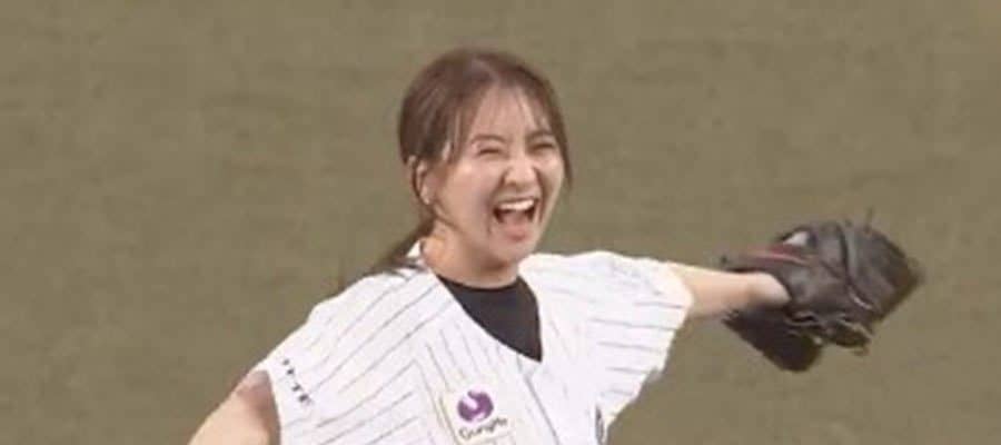 【実際の映像】スカートお構いなし…頭より高い“超豪快足上げ”にスタンド思わずどよめき…フリーアナ袴田彩会さんの“軟体始球式”