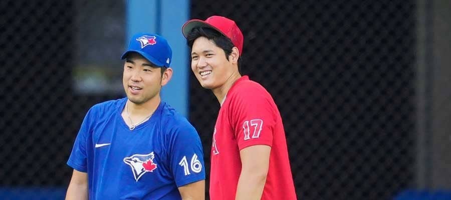 試合前に談笑するブルージェイス・菊池雄星(左)とエンゼルス・大谷翔平【写真:Getty Images】