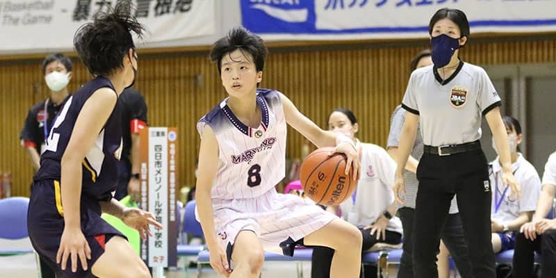 今年の1月に行われ、当時は2年生で出場した「Jr.ウインターカップ2021-22」でも、スターターとして優勝に貢献した四日市メリノール学院中学(三重県)の濱田ななの(3年)。最上級生となって迎えた「第52回全国中学校大会」では、司令塔として落ち着いた試合運びや積極的な攻めなど、持てる力をいかんなく発揮し、チームを連覇へと導いた。