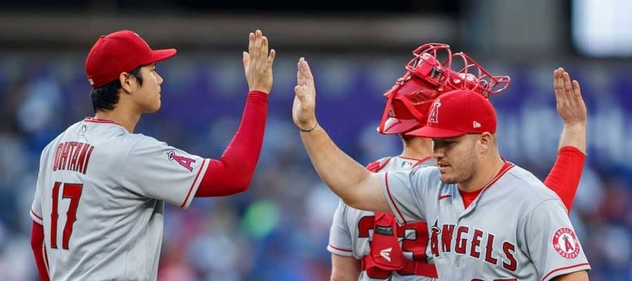 勝利しハイタッチをするエンゼルスの大谷翔平(左)とマイク・トラウト【写真:Getty Images】