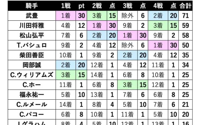 頂点に立ったのは武豊騎手。第1戦をメイショウツツジで勝利し30ポイントを獲得。第2戦はアサケレディに騎乗し3着となり15ポイントを獲得し、1日目を首位で終えた。第3戦では騎乗予定だったラブスピールが出走前に競走除外となり、6ポイント加算。最終戦ではカフジアスールとのコンビで2着となり20ポイントを獲得し、合計71ポイントで優勝を果たした。