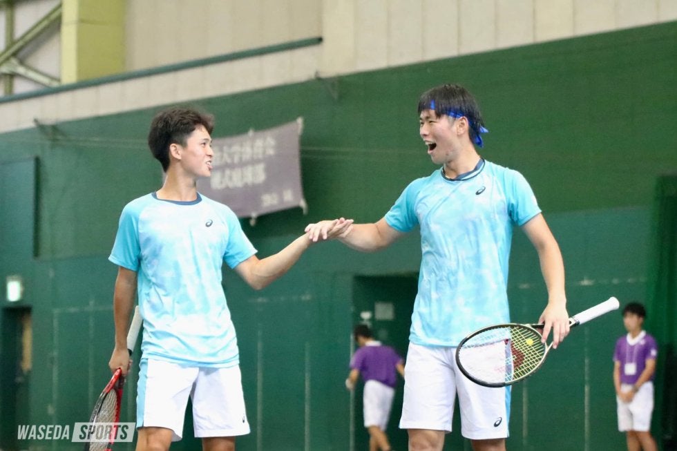 ダブルスの1勝は、増田健吾(社4=東京・早実)池田朋弥(スポ3=愛知・誉)組が獲得した。第1セットは互いにキープする展開に。デュースに迫る場面もあり、ブレークに近いのは常に早大だったが、相手のサービスゲームから始まった第1セットは余裕がなく、なかなかブレークとはならない。6-6となり、タイブレークに突入した。サービスで相手を崩し、強気な攻めで相手に2ポイントのみを与え、第1セットを獲得した。続く第2セットは、応援を力に意地を見せる明大にリズムを崩される場面もあったが、1点ずつ丁寧に積み重ね、7-5で勝利を収めた。