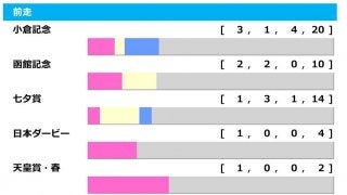 小倉記念 【3-1-4-20】 勝率10.7%、連対率14.3%、複勝率28.6% 函館記念 【2-2-0-10】 勝率14.3%、連対率28.6%、複勝率28.6% 七夕賞 【1-3-1-14】 勝率5.3%、連対率21.1%、複勝率26.3% 日本ダービー 【1-0-0-4】 勝率20.0%、連対率20.0%、複勝率20.0% 天皇賞・春 【1-0-0-2】 勝率53.3%、連対率53.3%、複勝率53.3% クイーンS 【1-0-0-2】 勝率33.3%、連対率33.3%、複勝率33.3% 常総S 【1-0-0-0】 勝率100.0%、連対率100.0%、複勝率100.0% ジューンS 【0-1-1-1】 勝率0.0%、連対率33.3%、複勝率66.7% エプソムC 【0-1-0-10】 勝率0.0%、連対率9.1%、複勝率9.1% マレーシアC 【0-1-0-2】 勝率0.0%、連対率33.3%、複勝率33.3% 大阪杯 【0-1-0-0】 勝率0.0%、連対率100.0%、複勝率100.0%