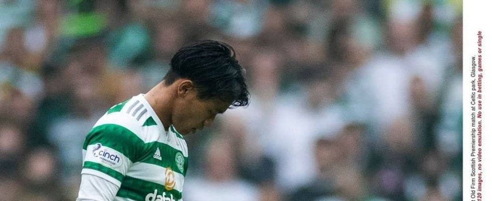 試合序盤で肩を負傷したセルティックのサッカー日本代表・古橋亨梧 写真:REX/アフロ