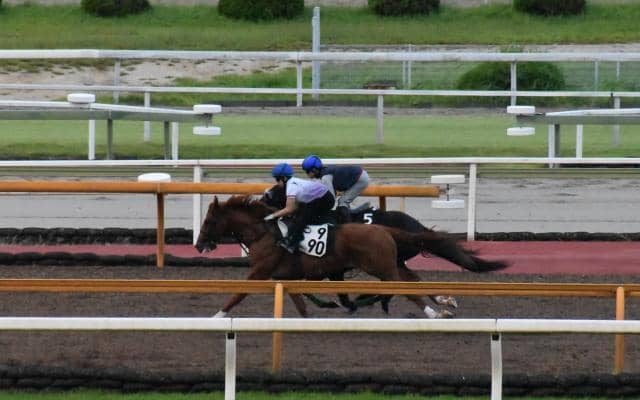 神戸新聞杯に向けて追い切りを行っているジャスティンパレス(写真奥、撮影:井内利彰)