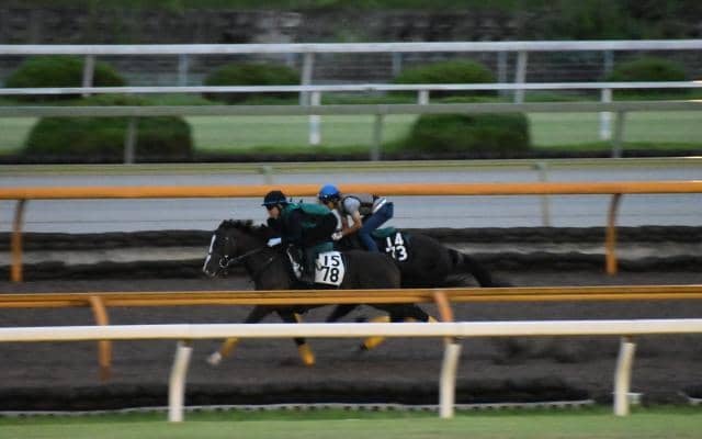 セントライト記念に向けて追い切りを行っているセイウンハーデス(写真奥、撮影:井内利彰)