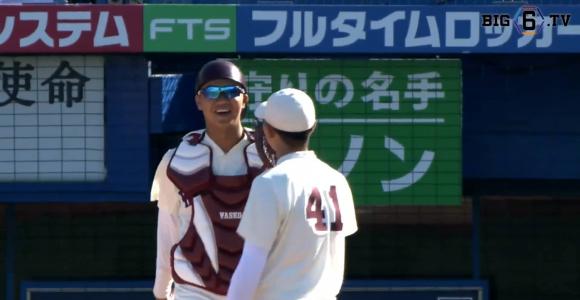 先発の加藤孝太郎(③下妻一)は8回まで投げて4奪三振、無失点の好投を見せる。最終回は伊藤樹(①仙台育英)が無失点で抑え試合終了。2対0で早大が勝利し初戦を手にした。