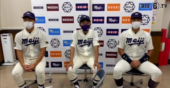 【ヒーローインタビュー】明治大学 田中武宏監督・蒔田稔(③九州学院) ・上田希由翔(③愛産大三河) | 東京六大学野球