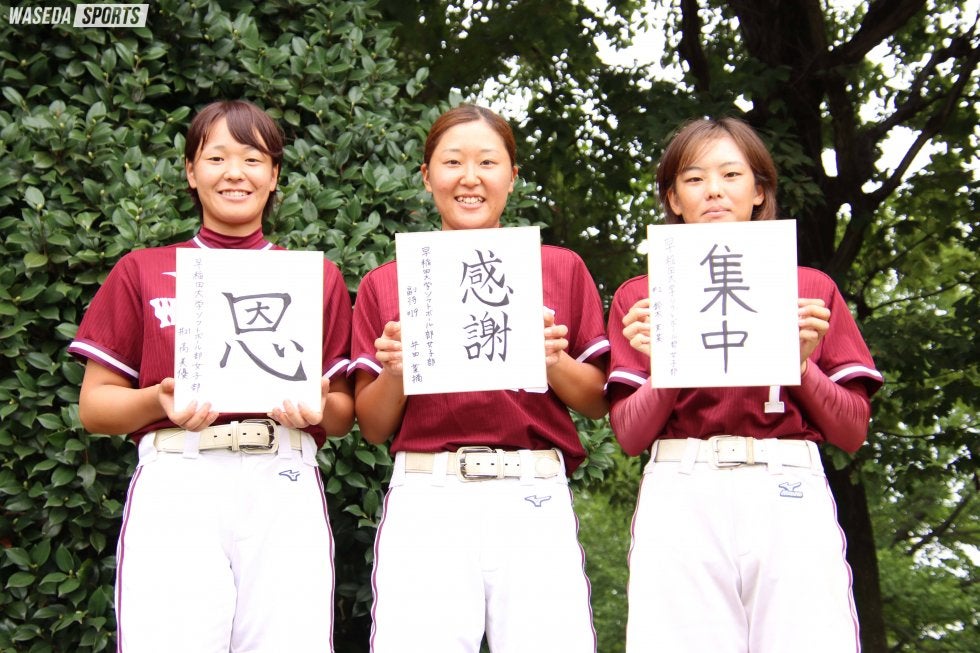 女子部1回目となる今回は、井田菜摘副将(スポ4=高崎健康福祉大高崎)、鈴木茉菜(スポ4=東京・鷗友学園女)、高美優(スポ3=福岡中央)が登場する。二遊間コンビを組む井田と高、一塁を守る鈴木茉は打線でも主軸を担い、全日本大学選手権(インカレ)を勝ち上がるためには3人の活躍が欠かせない。インカレでの悔しさも知る3人の思いを伺った。