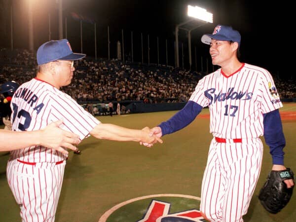 1998年に野村克也監督(写真左)のもと最多勝、沢村賞を獲得した川崎憲次郎氏