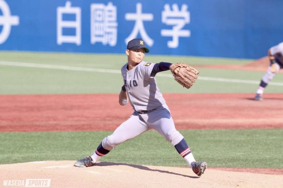 雲一つない晴天の下、慶大は立大との第2戦に臨んだ。慶大は初回、萩尾匡也(4年)の適時二塁打で先制に成功する。5回には山本晃大(4年)の適時二塁打で追加点を挙げた。投げては外丸東真(1年)が8回途中1失点の好投を披露。後を継いだ橋本達弥(4年)がリードを守り切り、2-1で勝利を収めた。