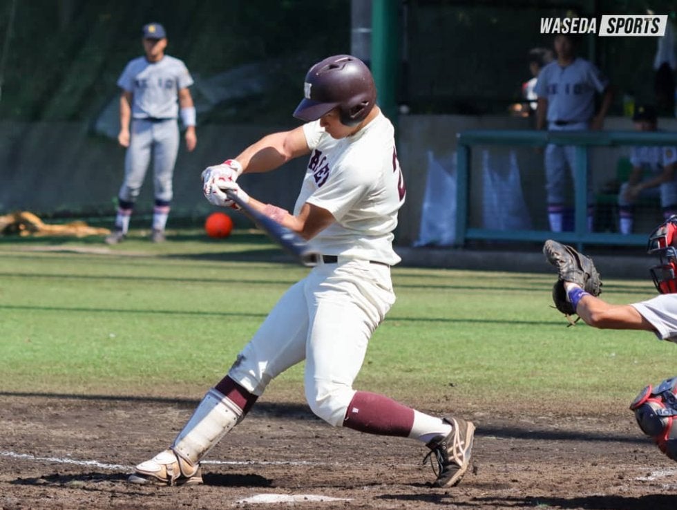 両校ゼロ行進のまま迎えた5回表、ついに試合が動いた。先頭から二者連続四球で無死一、二塁とすると、次打者の渡邉真之介(社3=早稲田佐賀)がセーフティバントを決めて好機を拡大した。続く打者は、秋リーグ初スタメンの久保嶋。「押し負けないように」と思い切り振った打球は右翼手の頭を大きく超える満塁本塁打に。大きな先制点を獲得した。さらに、6回には川原が今季初安打初本塁打を記録し、リードを5点まで広げた。