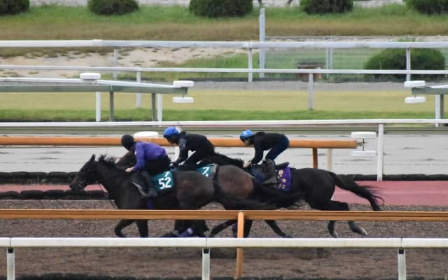 毎日王冠へ向け1週前追い切りを行うポタジェ(写真右、9月28日撮影:井内利彰)