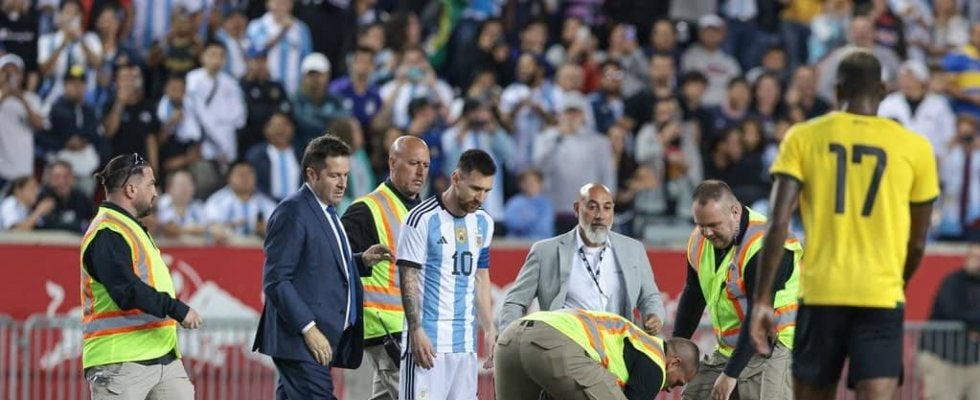 アルゼンチン代表FWリオネル・メッシ(中央)と乱入男を取り押さえるセキュリティ 写真:USA TODAY Sports/ロイター/アフロ