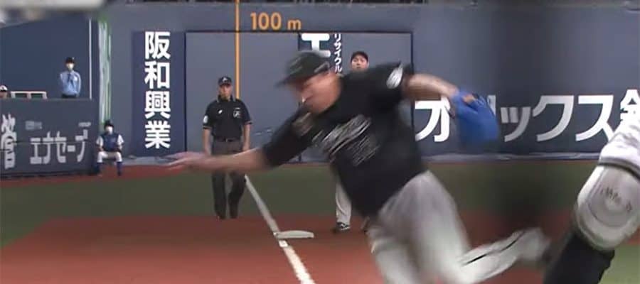 首位のソフトバンクが一足先に楽天に勝利し、オリックスは勝ち以外は許されない状況。2-2の同点で迎えた8回、1死から宗が右中間を破る二塁打を放つと、2死一、三塁とチャンスが広がった。ここで益田が頓宮に投じた初球のシンカーがワンバウンドとなり、捕手の松川は前に弾いた。後逸ではなかったが宗は迷わずにスタート。益田と松川が2人ともボールに向かっているわずか3秒ほどの間にホームインした。
