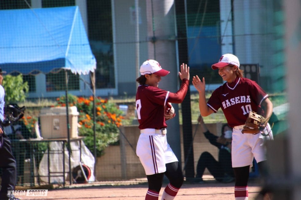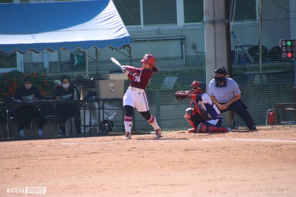 4回、1死から高美優主将(スポ3=福岡中央)と関の連打で1死二、三塁の好機を迎える。原田理子副将(スポ3=千葉経大付)の打球は前進守備の二塁手後方へのフライとなるも、二塁手がこれを落球。この間に1点を先制する。