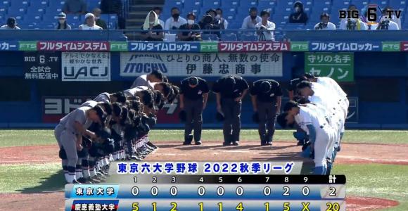 終わってみればチーム24安打、20得点の猛攻を見せ六大学史上4回目の毎回得点を達成し、東大相手に2対20で快勝。