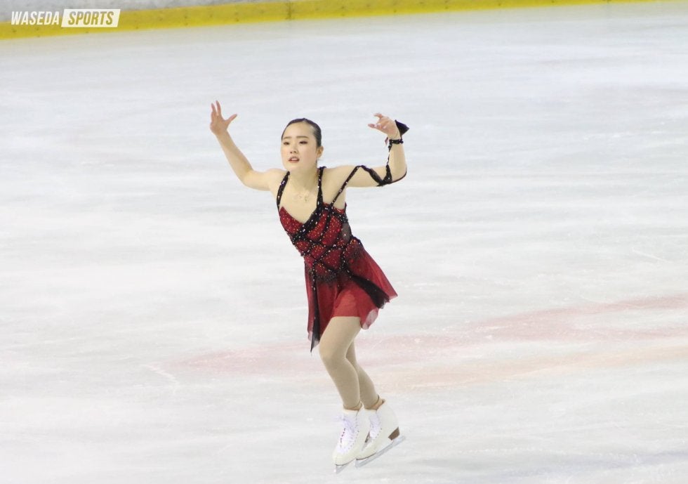 SP16位でFSに進んだ馬場はるあ(社3=東京・駒場学園)は第2グループに登場。腕まで装飾が施された、赤と黒のクールな衣装に身を包み、披露するプログラムは『Never Go Back / My Immortal 』。繊細で重厚なピアノ曲を表現するSPとは異なる世界観を持ったプログラムだ。直前まで演技の流れを念入りに確認し、少し緊張した面持ちでゆっくりとポジションについた。曲が始まると、最初のモーションから指先まで使った力強い表現で、見ている人を曲の世界観に引き込む。冒頭、2回転ルッツは成功するも、その後の3回転ジャンプを連続で失敗してしまい、不安な滑り出しとなった。しかし、中盤の2回転アクセルや、連続ジャンプを着氷。回転不足はあったものの見事立て直し、そのまま曲が盛り上がるにつれて馬場の演技も完成されていく。感情が滑りに乗ったステップと、丁寧なスピンで美しい演技を披露。最後の表情までしっかりと演じ切り、演技終了後には笑顔も見られた。大会の際には「緊張する」と以前から語っていた馬場だが、今回の演技では切り替えの早さと気持ちの強さが感じられた。FSの得点は77・91点、総合得点は119・84点となった。SPから2つ順位を上げて最終順位14位で終え、東日本選手権への出場権を勝ち取った馬場。滑り込んできたプログラムにはまだ伸びしろがある。SPとFS、共に最高の演技をするため、シーズン終盤まで磨きをかけていく。