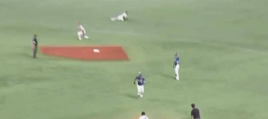 【実際の映像】走者の背中に送球直撃も…奇跡の“すっぽり” まさかの珍プレーに球場騒然