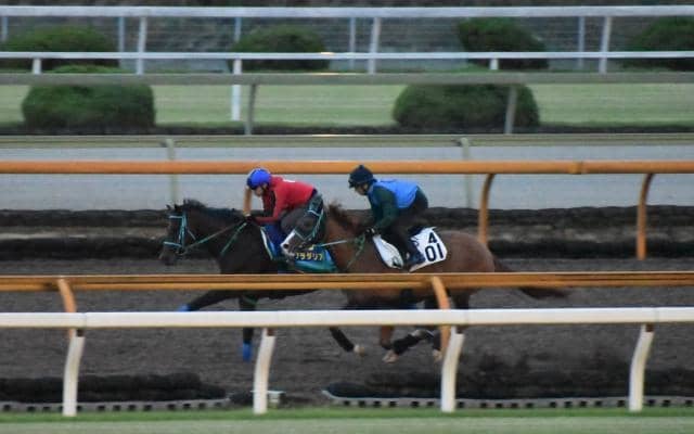 菊花賞に向け1週前追い切りを行うプラダリア(写真奥、撮影:井内利彰)