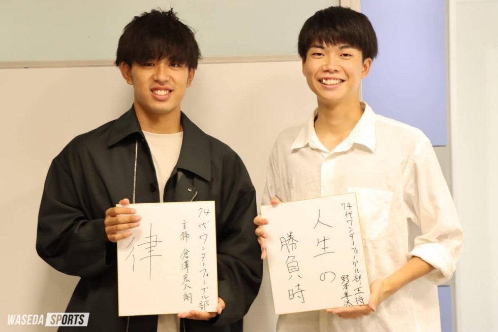野本 一言か…一言と言われるとちょっと考えますけど、部活もありますし、代も取って主将ですし、歴史ある部活なので名に恥じぬようにやりたいですし、就職活動もあるので、その辺もしっかりやりつつ。学業の方も危ういので(笑)就活は人生のターニングポイントですし、ここで留年したら、というのもあるので、そして歴史ある早稲田の体育会の主将となったということで、人生の勝負時かなと。1年間人生の勝負時を正面から乗り越えたいと思います。