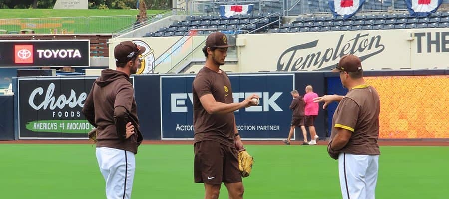 前日の第2戦で6回途中7安打3失点と粘投し、1勝1敗のタイに持ち込む貴重な勝利を牽引したダルビッシュ有投手は、全体練習が行われる約1時間前に、外野で入念なキャッチボールを行い登板翌日のルーティンで調整した。その後は、ニエブラ投手コーチと戦略を担当するサマービルコーチ補佐を交え、チェンジアップの握りなどについて10分以上に渡る意見交換を行った。(木崎英夫 / Hideo Kizaki)