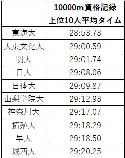 まずは他大学との比較を行う。資格記録を見ると、エントリーメンバーの1万メートル上位10人の平均タイムは29分18秒50。このタイムは出場校中9位と箱根本戦へ道は決して簡単ではないことが伺える。加えて、平均タイム29分17秒から29分20秒の間には神奈川大、拓殖大、城西大、中央学院大がおり、早大としてはこの4大学との混戦を避けて、上位進出を狙いたいところだ。また、東海大は上位10人の平均タイムが唯一28分台に乗っており、上位通過を目標とする早大にとっては難しい相手になる。