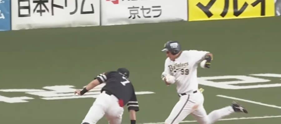 オリックスが2点をリードした8回の攻撃。この日本塁打を放っている杉本が、三塁手の前へ大きくバウンドする打球を放った。周東がこの打球にチャージし一塁へ遠投。送球がそれたものの、これを追った中村晃はギリギリ左足をベースに残しておりアウト。リプレー検証の結果も、再びアウトが宣告された。一塁に駆け込んでくる杉本をよけながらのプレーは超・高難易度だった。