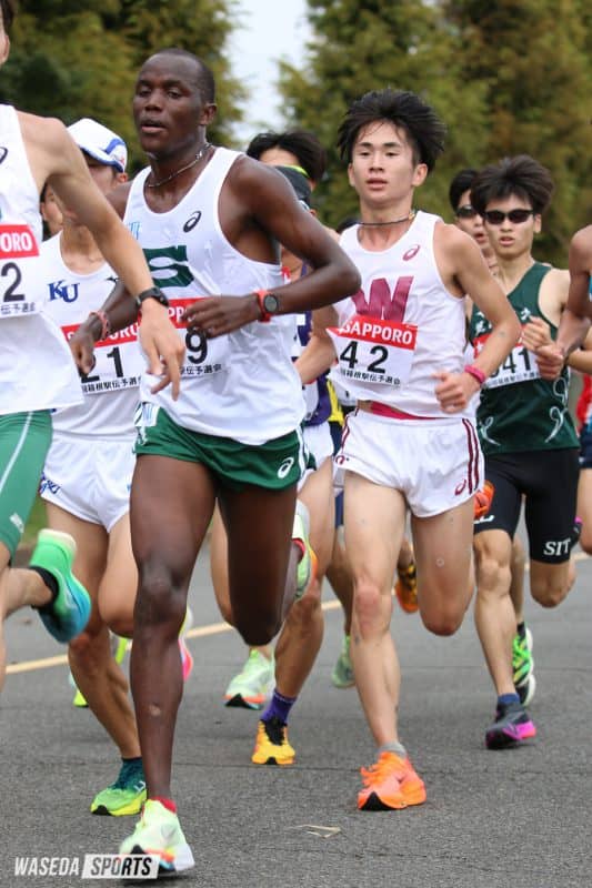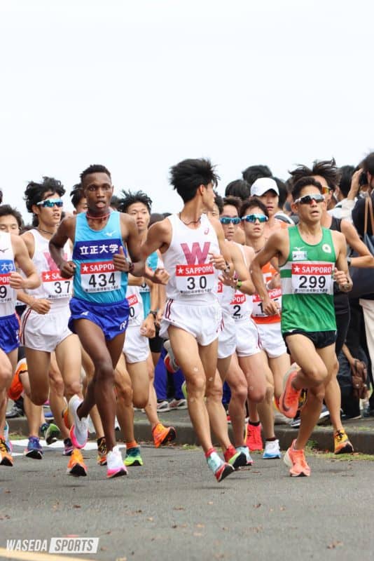 日本人の2番手集団では鈴木創士駅伝主将(スポ4=静岡・浜松日体)、佐藤航希(スポ3=宮崎日大)、伊藤大志(スポ2=長野・佐久長聖)の3人が集団から離れることなくレースを進めた。レース中盤に伊藤が脱落してしまったものの、鈴木、佐藤はレース終盤まで近い位置でレースを進めた。最後は佐藤がスパートで抜け出し、学内2番手でフィニッシュ、それに鈴木が続く形となった。佐藤は先月の早大記録会で1万メートルでのベストを更新したのに続いて、ハーフマラソンでも自己ベストを更新、調子の良さがうかがえる。集団からは遅れてしまった伊藤も、最後まで自分のペースを刻み続け、学内4番手でゴールした。それ以降の選手は一人一人が周りに惑わされることなくしっかりと自分のペースでレースを進め、多くの選手が自己ベストを更新する走りを見せた。一方で山口智規(スポ1=福島・学法石川)はレース中盤までは堅実なレース運びを見せたものの終盤に失速してしまった。こちらは今後のレースでのリベンジを期待したい。