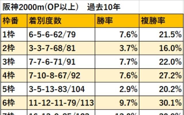 一方で、阪神2000mの2枠は鬼門となっているようだ。複勝率は唯一20%に届かず、勝率もかなり低調な数字となっている。昨年は1番人気ソダシが2枠に入ったが、結果は10着に敗れている。2枠に入った馬にとっては厳しいデータと言えるだろう。