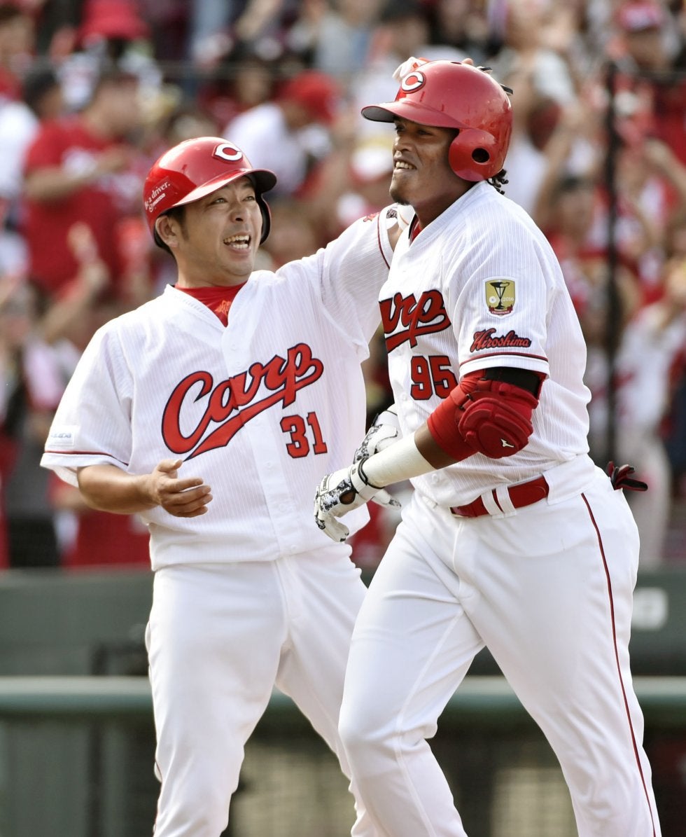 広島―ロッテ 6回、来日初打席で2ランを放ち、二走石原(左)に迎えられる広島・バティスタ=マツダ【写真提供:共同通信社…