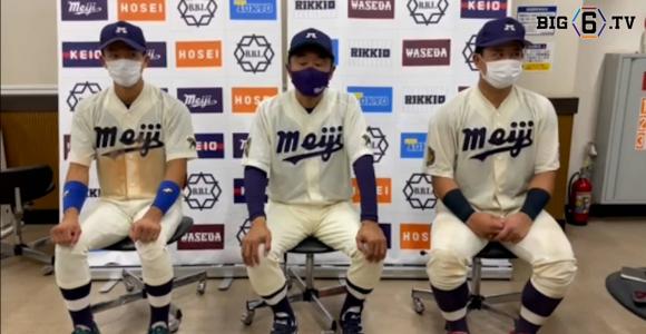 【ヒーローインタビュー】 明治大学 田中武宏監督・明新大地(④明大中野)・蓑尾海斗(④日南学園) | 東京六大学野球