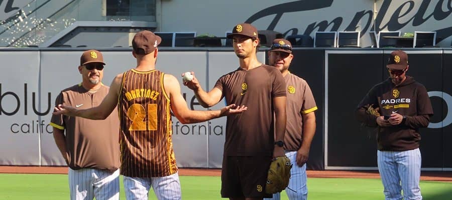 同僚のニック・マルティネスと意見交換を行うパドレス・ダルビッシュ有【写真:木崎英夫】