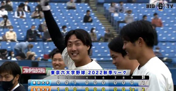 そして最終回、法大は先頭の浦和博(③鳴門)が倒れるも、続く内海貴斗(③横浜)がライトスタンドへ会心の当たりのサヨナラホームランを放ち試合終了。