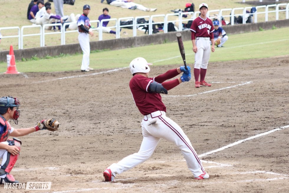 試合が最初に動いたのは0-0で迎えた2回だった。早大は2死から齋藤向陽(社2=群馬・新島学園)の四球、田中宏二(人2=大分舞鶴)の安打、小出拓実(人2=東京・杉並)の四球で満塁までこぎ着ける。ここで2番・畠山陸(スポ2=高知西)が押し出しとなる四球を選ぶと、続く稲垣が中堅へ走者一掃の適時打を放つ。早大はこの回、4点の先制に成功した。