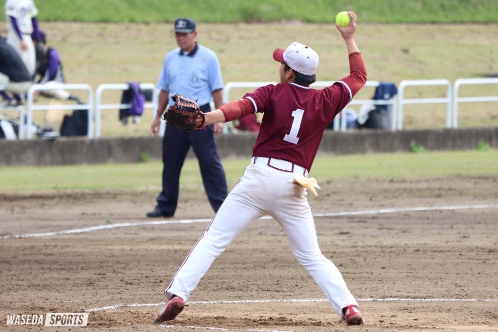 大量の援護を得た投手陣は先発の佐藤慶が圧巻の投球を見せる。「今まで練習してきたのが実った」というドロップが冴え渡り、3回で6三振を奪い、完全投球で先発の役割を全うした。12点リードとなった4回には川崎が登板。3安打を浴び、2点を奪われるも、持ち前の打たせて取る投球でそれ以上の失点を許さず、早大は代替わり後初となるコールド勝ちを飾った。