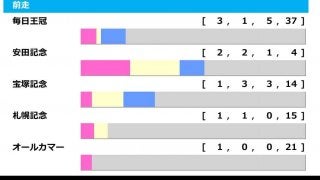 毎日王冠 【3.1.5.37】 勝率6.5%、連対率8.7%、複勝率19.6% 安田記念 【2.2.1.4】 勝率22.2%、連対率44.4%、複勝率55.6% 宝塚記念 【1.3.3.14】 勝率4.8%、連対率19.0%、複勝率33.3% 札幌記念 【1.1.0.15】 勝率5.9%、連対率11.8%、複勝率11.8% オールカマー 【1.0.0.21】 勝率7.3%、連対率7.3%、複勝率7.3% 京都大賞典 【1.0.0.13】 勝率7.1%、連対率7.1%、複勝率7.1% 日本ダービー 【1.0.0.1】 勝率50.0%、連対率50.0%、複勝率50.0%