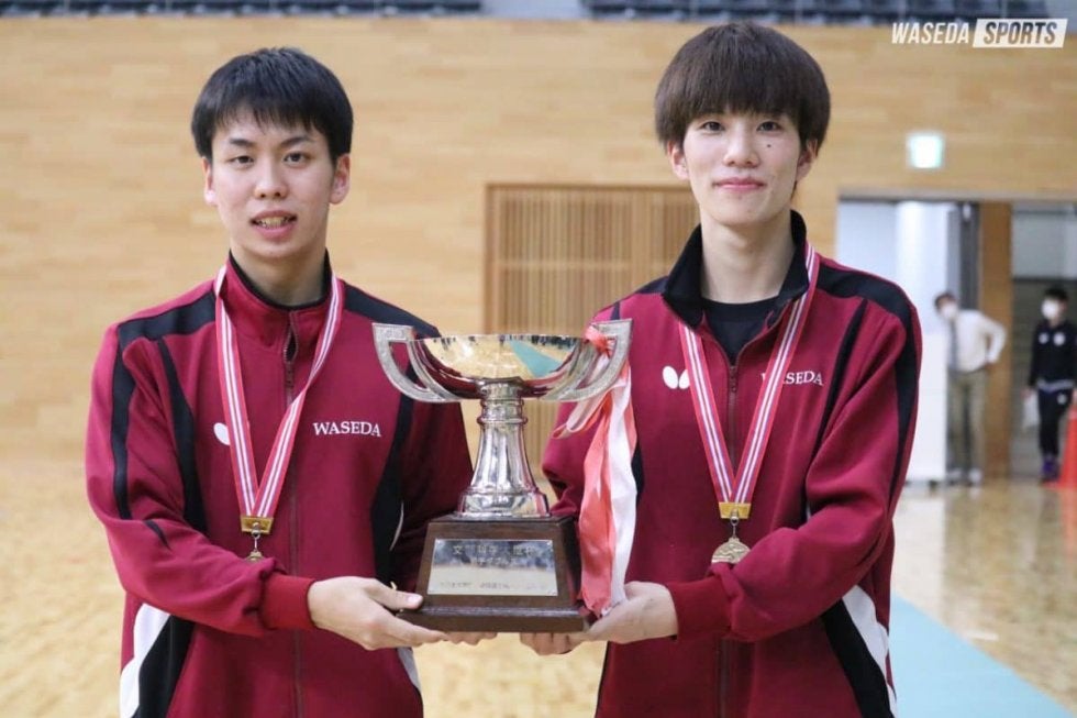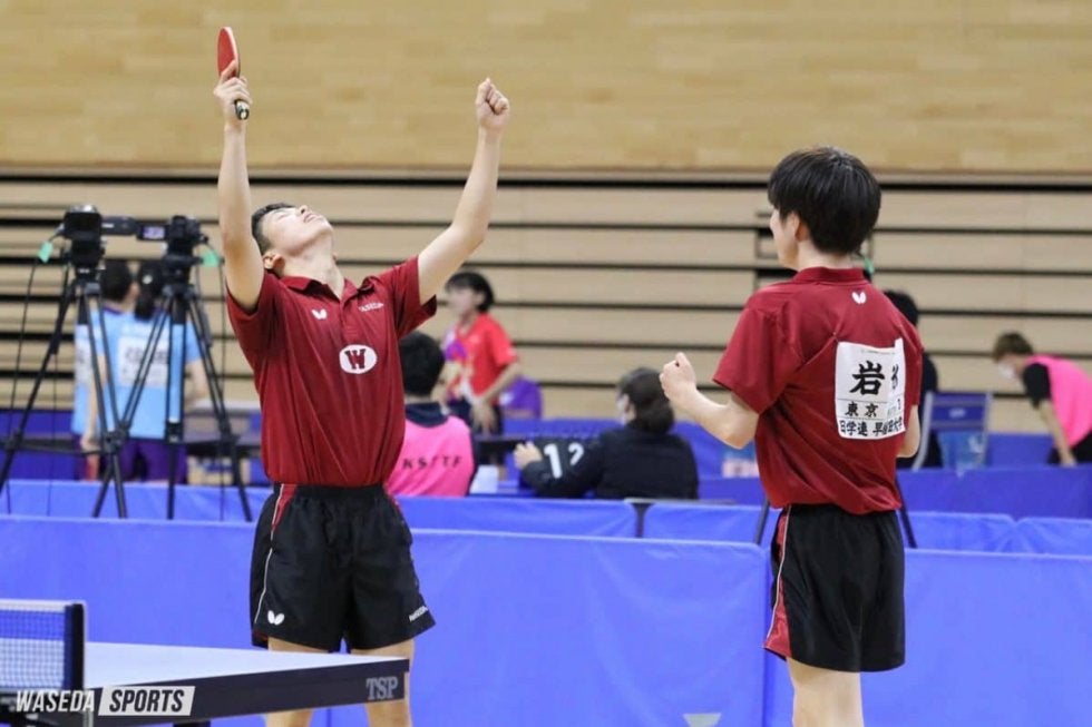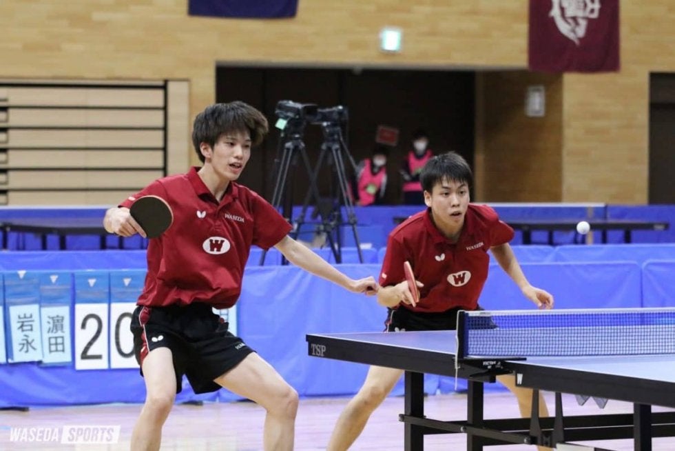 10月20日に開幕した全日本学生総合選手権・個人の部(全日学)は大会3日目を迎え、ダブルスの準決勝以降が行われた。早大からは、前日にベスト4入りを決めた岩永宜久(スポ4=福島・帝京安積)・濵田一輝(スポ1=愛知・愛工大名電)組が出場。岩永・濵田組は、準決勝でゲームカウント1―2から逆転勝利を収め勢いに乗る。決勝では9月に敗れていた日大ペアに雪辱を果たし、初優勝した。