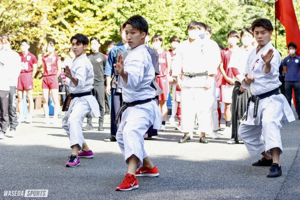 時刻が12時30分にさしかかるころ、ステージでは応援部による応援曲メドレーが行われた。齋藤巽代表委員主将(教4=青森)をはじめリーダー4年生が続々とセンターリーダーを務め、『大進撃』『スパークリングマーチ』『コンバットマーチ』など早稲田を代表する応援曲を披露していく。センターリーダーの背後でリーダー下級生が拍手、吹奏楽団が生演奏、チアリーダーズがダンスで盛り上げると、司会のホワンが観衆へ手拍子を促し、会場が一体となってメドレーが完成された。応援曲メドレーが終了すると、空手部、少林寺拳法部によるスペシャルパフォーマンスを実施。最初に空手部の熊谷拓也(スポ2=東京・世田谷学園)、吉田蒼一郎(スポ2=東京・世田谷学園)、岩渕凌(スポ1=茨城・水城)がそろって型を披露する。風を切るような俊敏な動きに観客も息をのんで見守った。空手部が出番を終えると、少林寺拳法部の籾美吹主将(社4=大阪産業大付)と門田憲樹(商2=広島城北)が組演武を披露。投げ技が繰り出されるたび、観客から思わず驚嘆の声が飛び出す。両部ともに圧巻の演技を終えると、称賛の拍手が沸き起こった。