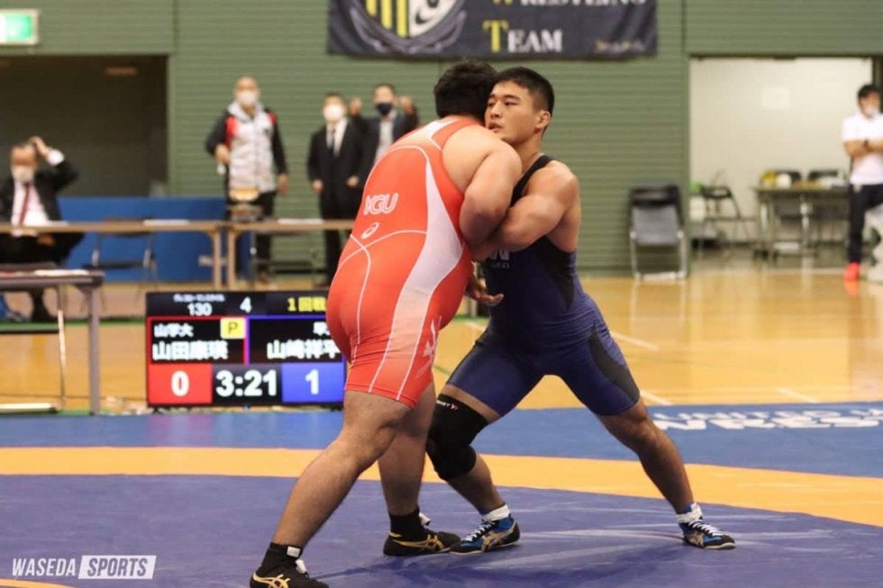 130キロ級の山崎副将は、初戦で山田康瑛(山梨学院大)とぶつかる。山崎は本来フリースタイル97キロ級を専門としているため、体格で相手に劣ったものの、互角な戦いを見せた。1-1で試合終了となったものの、最終ポイントを取っていた相手が勝利。山崎副将は初戦敗退となった。
