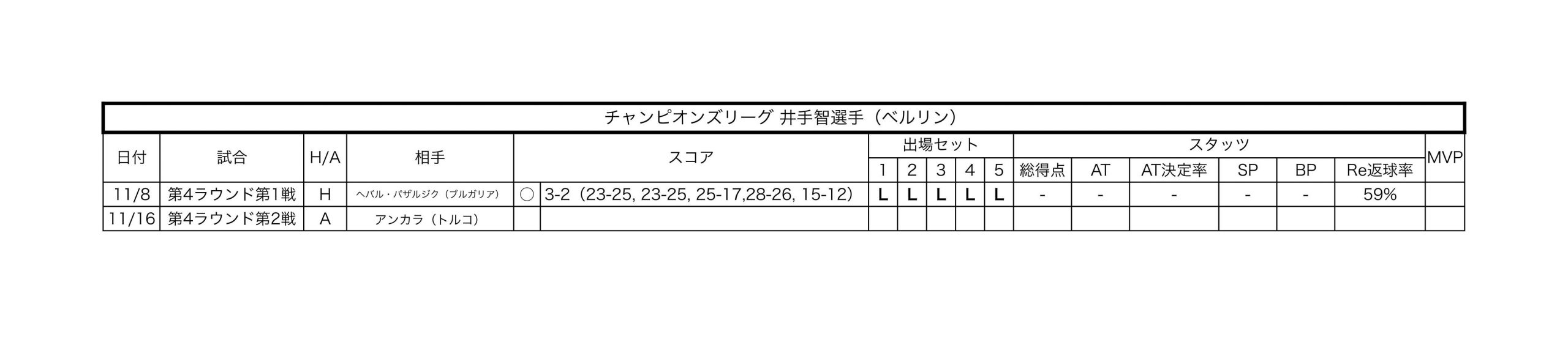 ※スタッツはAT(アタック)、SP(サーブ)、BP(ブロック)それぞれの得点数。Reはレセプション(サーブレシーブ)、かっこ内はAパスを示す。試合のMVP選出は☆