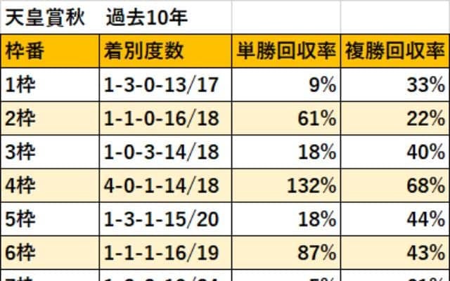 天皇賞秋を過去10年の枠順データから分析! 唯一単勝回収率が100%を超えた枠は? | その他競技