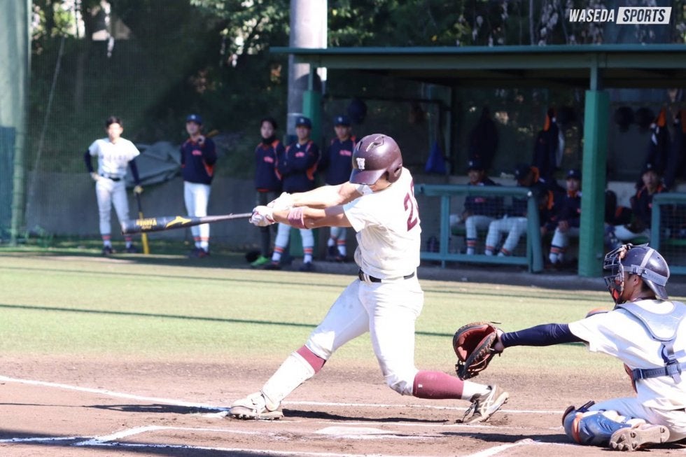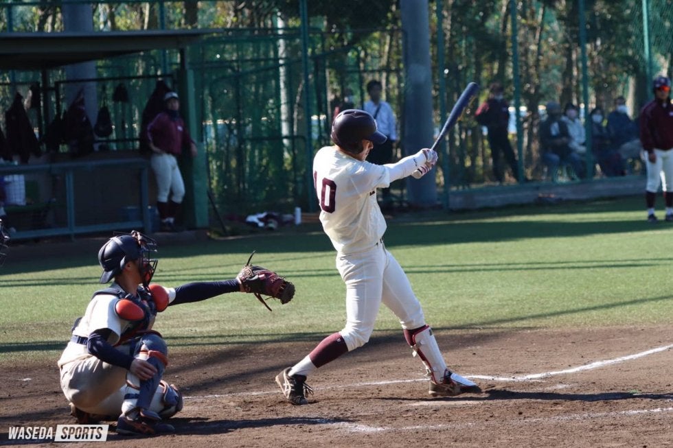 15、16日の明大戦で勝ち点を落とし、東京六大学秋季リーグ戦(秋季リーグ戦)での優勝が絶望的となった早大。この日は最終節となる法大戦の1回戦に臨んだ。秋季リーグ戦優勝が消滅し、関東地区大学・社会人王座決定戦(関東王座)進出への道も途絶えたいま、新井健太主将(商4=東京・早大学院)率いる体制で迎える試合はこの法大戦が最後。4年生の選手は最後の輝きを放つべく試合に臨んだ。試合は序盤から点を取り合う展開に。しかし6回、久保嶋真也(社2=神奈川・桐蔭学園)と吉松武竜(スポ4=早稲田佐賀)の適時打で勝ち越すと、8回には新井主将の2点適時打でダメ押し。最終節の初戦を白星で飾った。